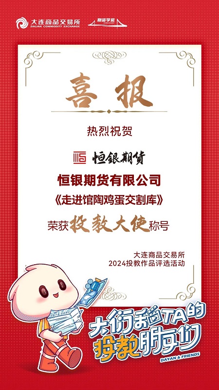 近日,由大連商品交易所舉辦的“大衍和TA的投教朋友們”——2024年大商所投教作品評選活動圓滿落幕。經過激烈的角逐和嚴格的評審,國富公司所屬恒銀期貨有限公司(以下簡稱恒銀期貨)憑借《走進館陶雞蛋交割庫》的投教視頻作品,成功榮獲“投教大使”稱號。