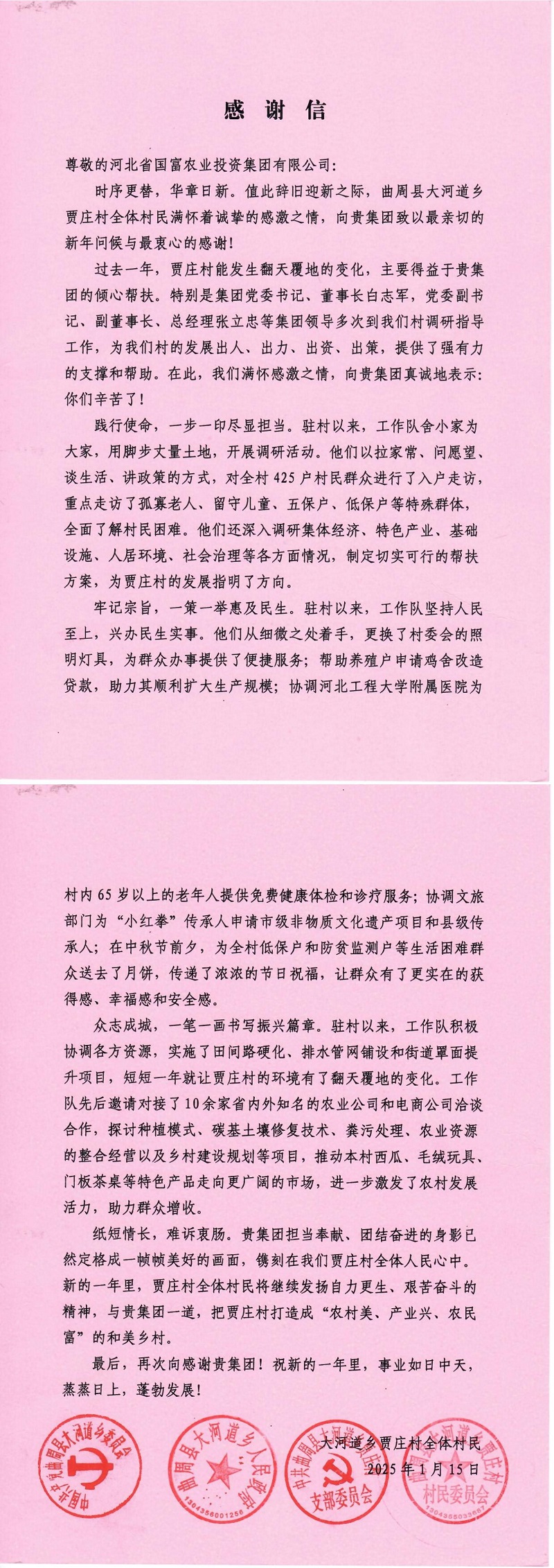 2024年,國富集團駐賈莊村下沉工作隊緊緊圍繞發展集體經濟、推進鄉村振興的目標,深入學習中央政策方針及省市縣委組織部和集團黨委有關下沉工作要求,扎實開展駐村幫扶工作,經過一年的努力,取得初步成效,同時也得到了曲周縣大河道鄉和賈莊村的認可,特給我集團送上錦旗和感謝信!
