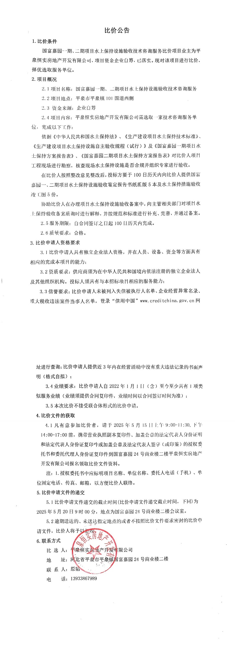 平泉國富嘉園一期、二期項目水土保持設施驗收技術咨詢服務比價公告